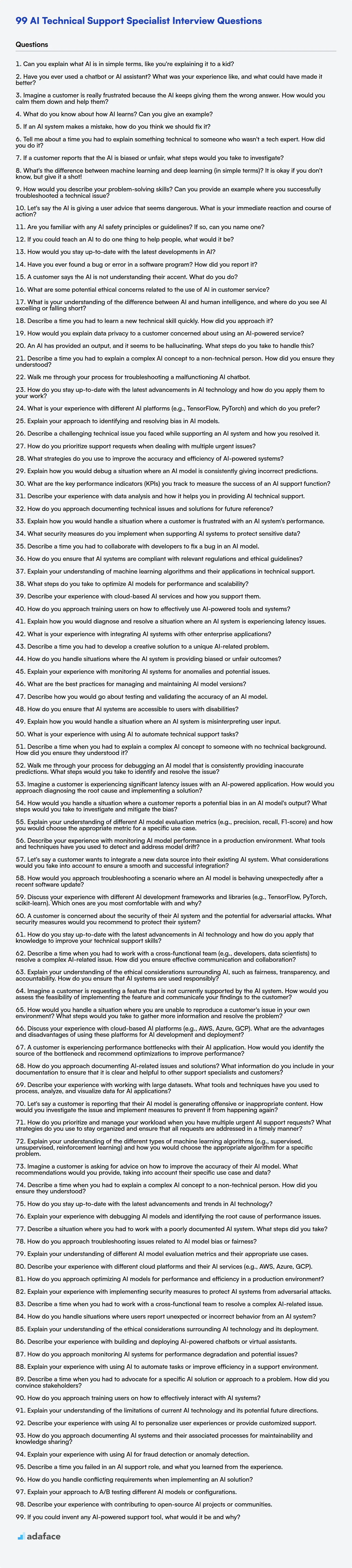 Recruiting an AI Technical Support Specialist requires a solid understanding of the skills required to excel in this domain. A well-prepared list of interview questions is useful to accurately assess candidates' qualifications, especially with the ever increase in AI adoption.