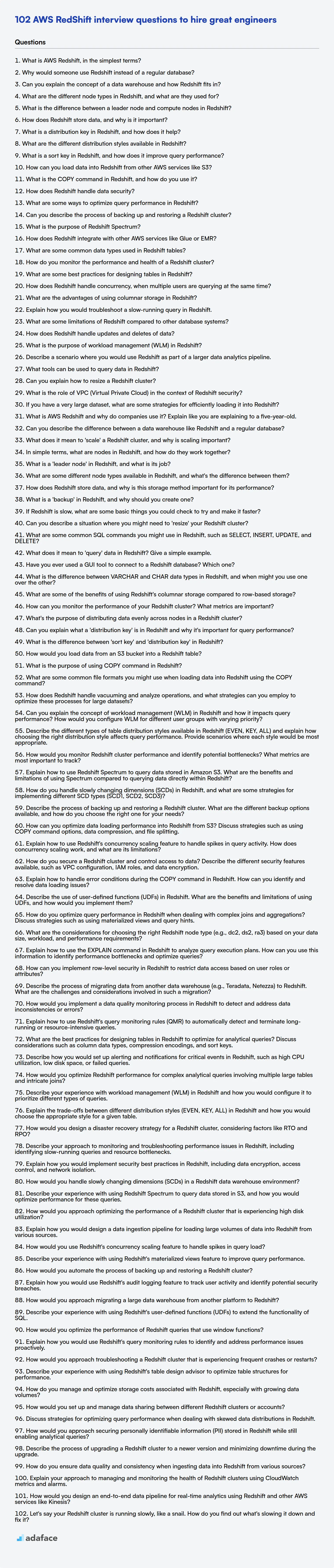 Hiring data professionals who can harness the power of cloud-based data warehousing solutions like AWS Redshift is more important than ever. Recruiters need to be prepared to ask the right questions to filter out the best candidates, as we discuss in skills required for data engineer.