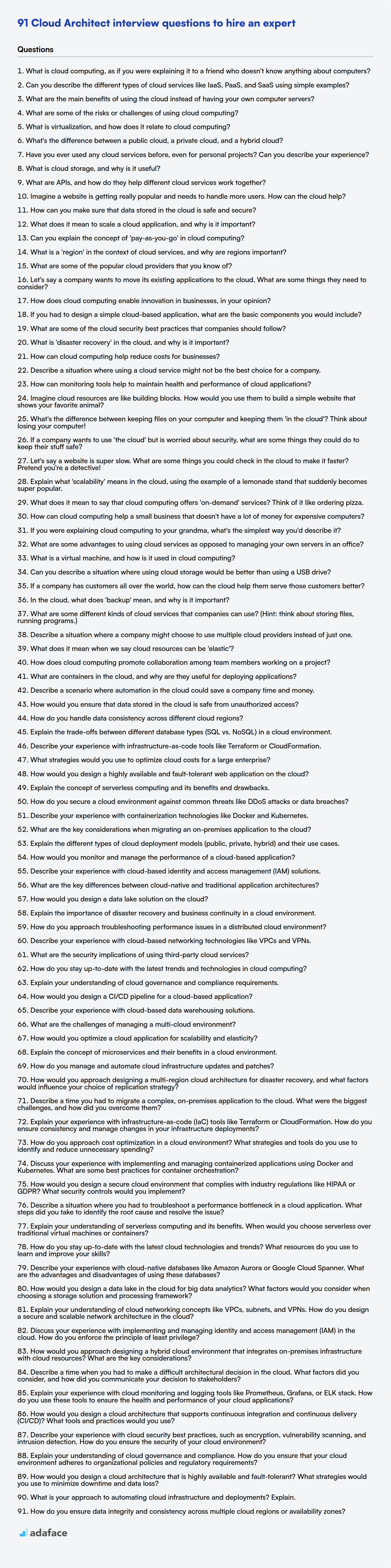 Cloud Architects are the masterminds behind designing, building, and managing an organization's cloud computing strategy and infrastructure; they oversee the implementation of cloud solutions. As with all tech roles, identifying the right talent involves more than just checking off a list of skills; it's about probing their understanding and practical knowledge.