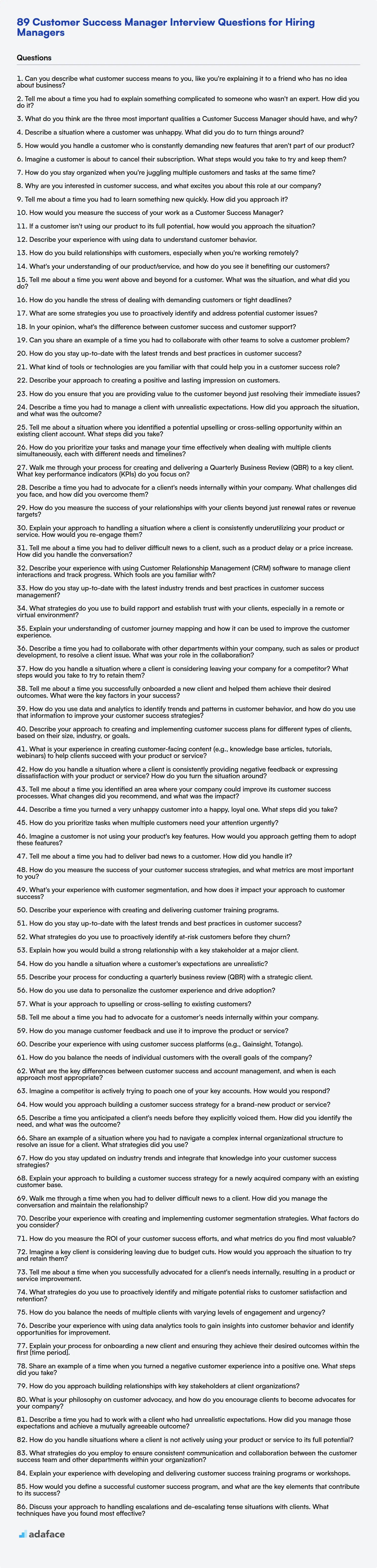 Using these questions will help you identify candidates with the right skills to excel, and before the interviews you can screen your candidates using Adaface's Customer Success Manager test to make your interviews more productive.