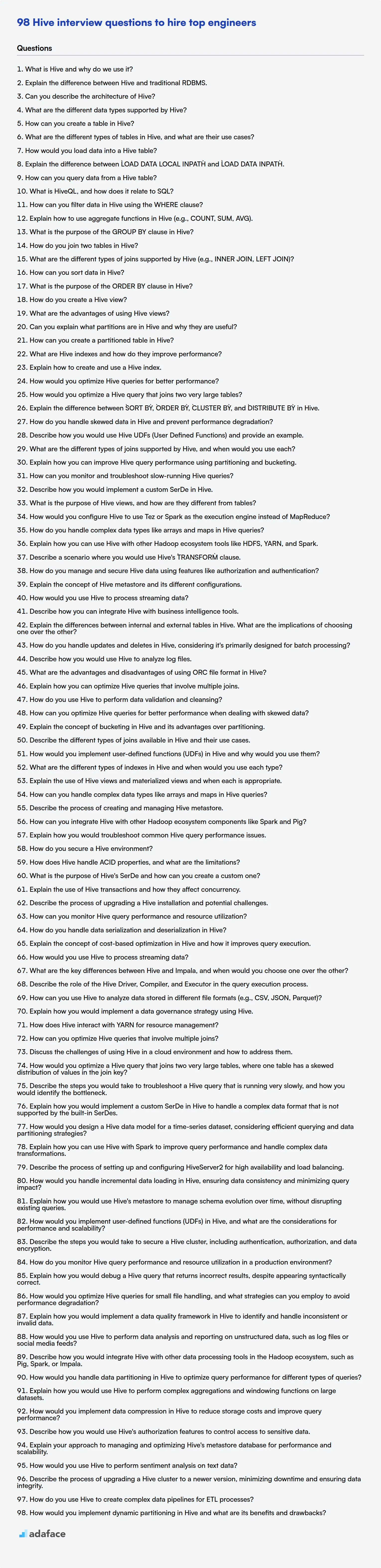 Hiring data professionals who are skilled in Hive can be difficult without the right screening process. Preparing a list of questions ensures that you can evaluate candidates thoroughly and understand their expertise in Hive.