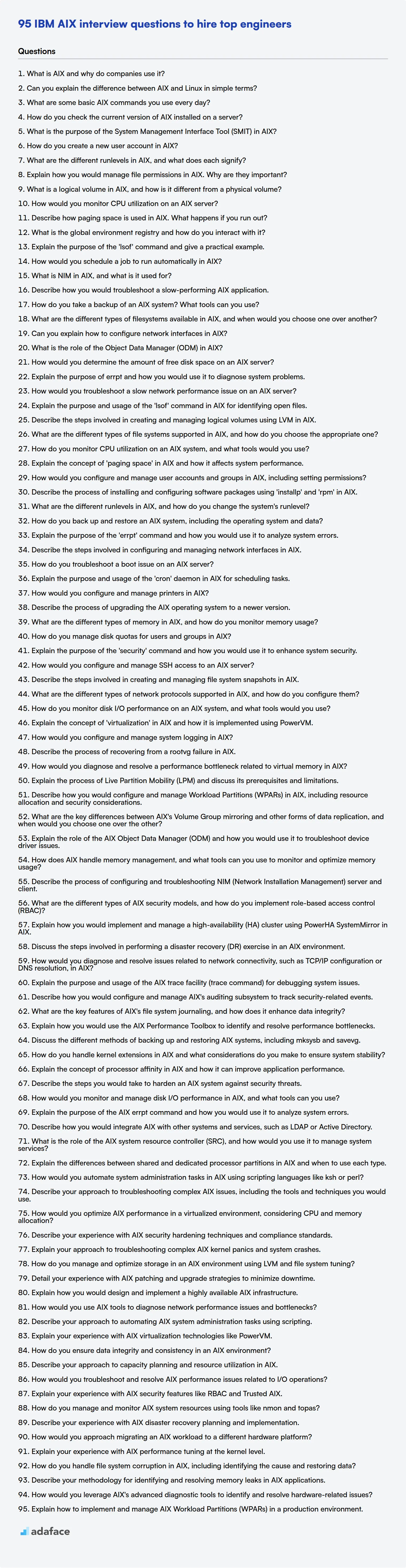 This blog post offers a collection of IBM AIX interview questions, ranging from basic to expert levels, including multiple-choice questions. It is designed to equip you with the tools to evaluate candidates for system administration roles.