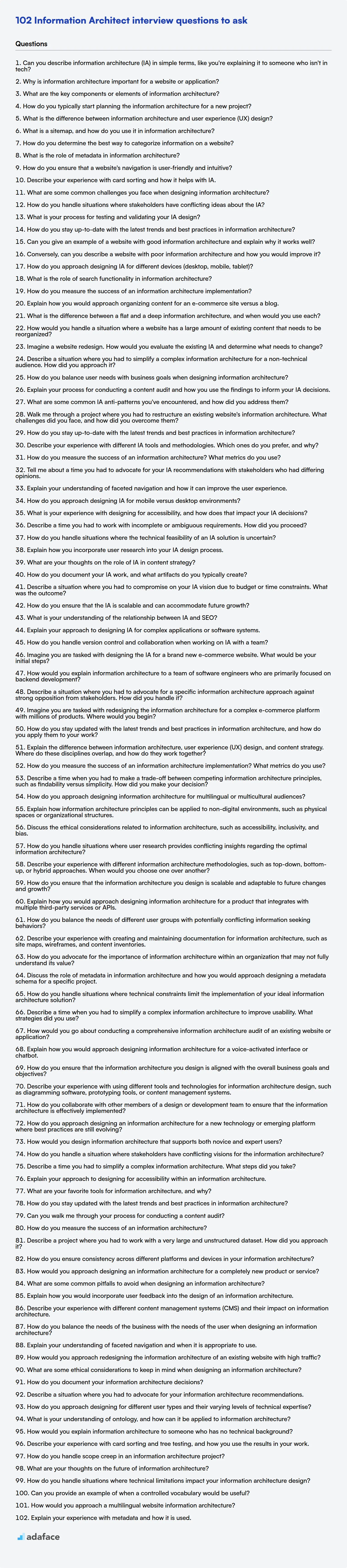Recruiters and hiring managers need a structured approach to evaluate Information Architect (IA) candidates. Having a comprehensive set of interview questions helps you assess a candidate's knowledge and experience effectively.
