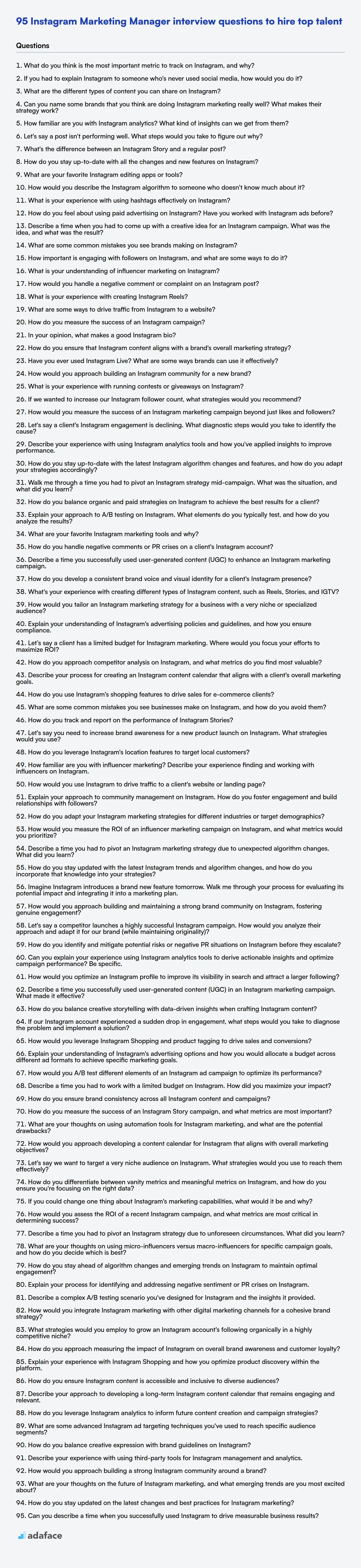 This blog post provides a collection of interview questions categorized by skill level, from basic to expert, along with multiple-choice questions, with the aim of helping you identify the best candidate for your team. This guide covers questions for Instagram Marketing Managers with different experience levels.