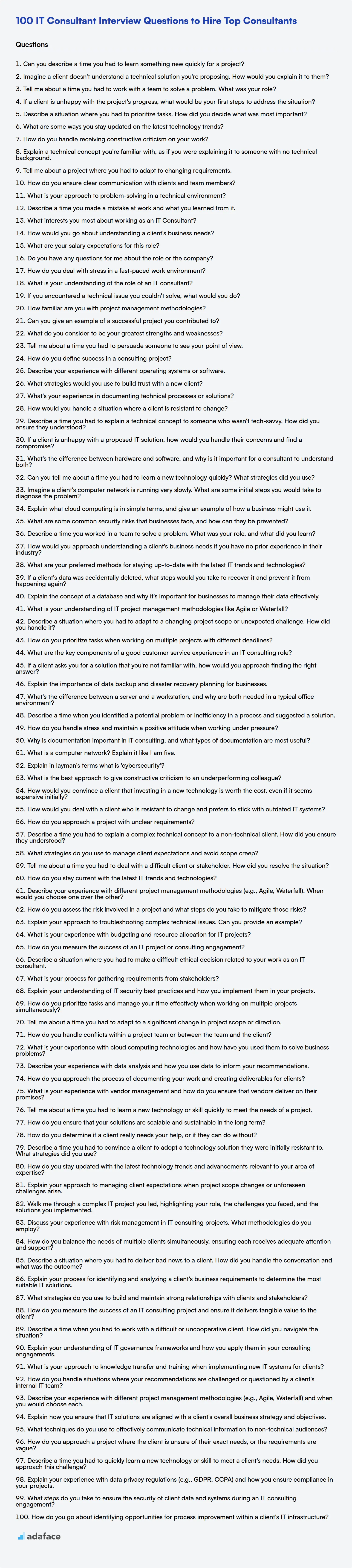 Hiring IT Consultants can be tricky because of the mix of technical expertise and soft skills needed to excel, not unlike what is needed for a solution architect. This list of interview questions is designed to help you identify candidates who possess the right blend of skills and experience.