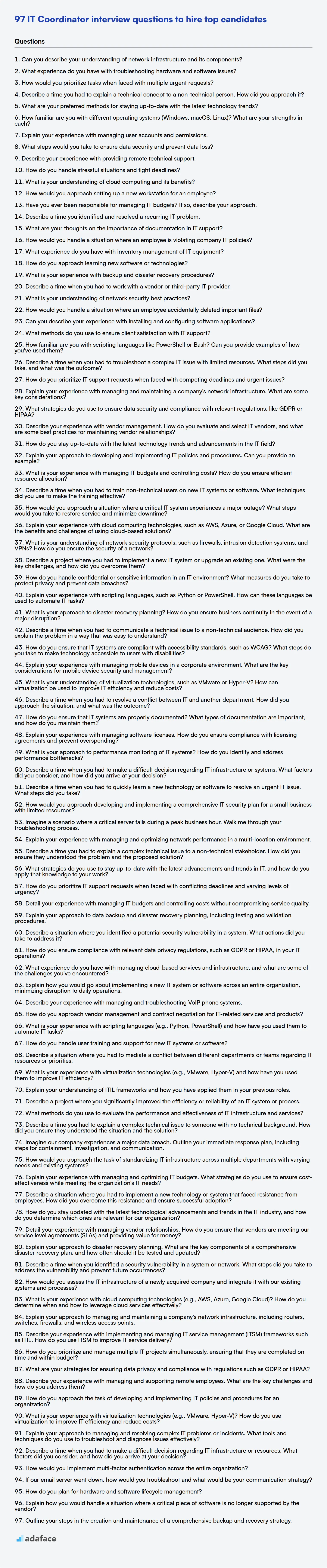 Hiring the right IT Coordinator is tough: you need someone who is organized and tech savvy. To ensure you select candidates who not only possess the required technical skills but also fit your company culture, a structured interview process is a must.