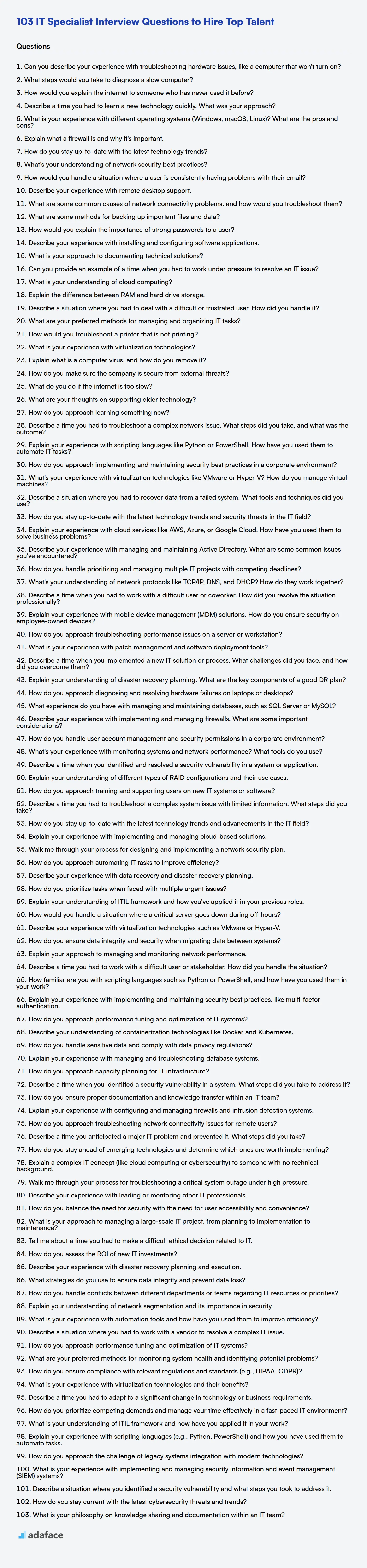 By using these questions, you'll be able to find the best IT Specialist for your organization, and, before the interviews, you could use our IT Freshers Test to quickly screen candidates.