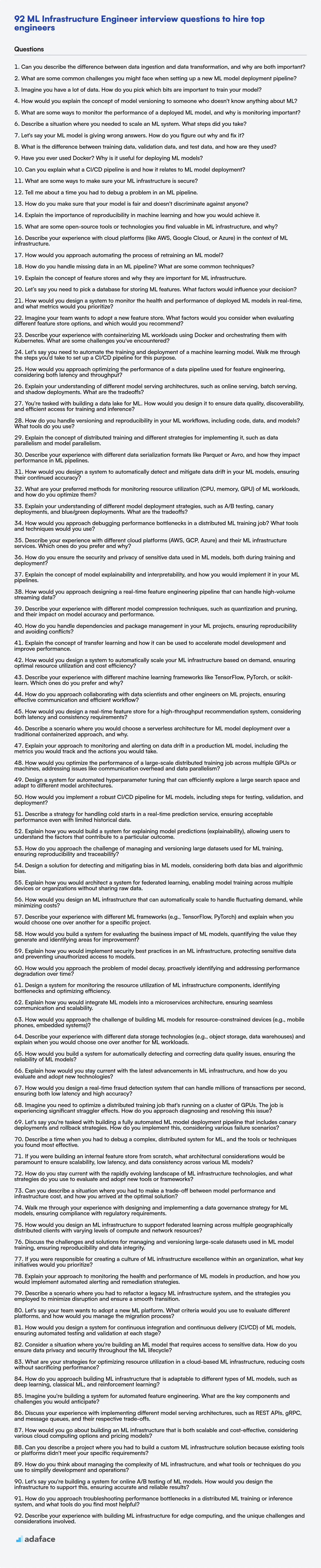 Use these questions to identify top talent and build a stronger, more capable ML infrastructure team. To streamline your hiring process, consider using Adaface's ML Infrastructure Engineer test to screen candidates before the interview.
