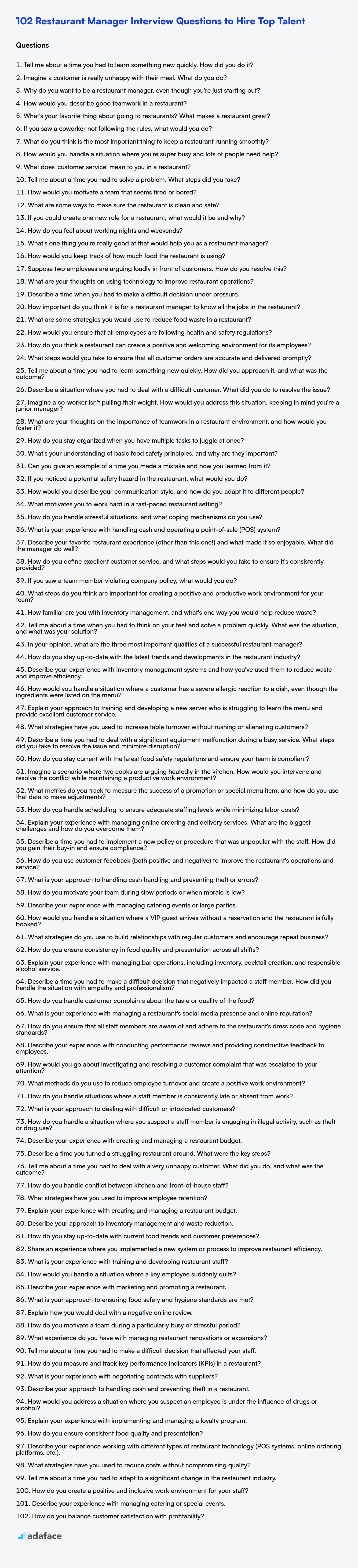 Time is valuable, so you need to curate a list of questions that will help you to find out if the candidate is suitable. Therefore, prioritize questions that reveal key competencies and experience that align with the restaurant manager role.