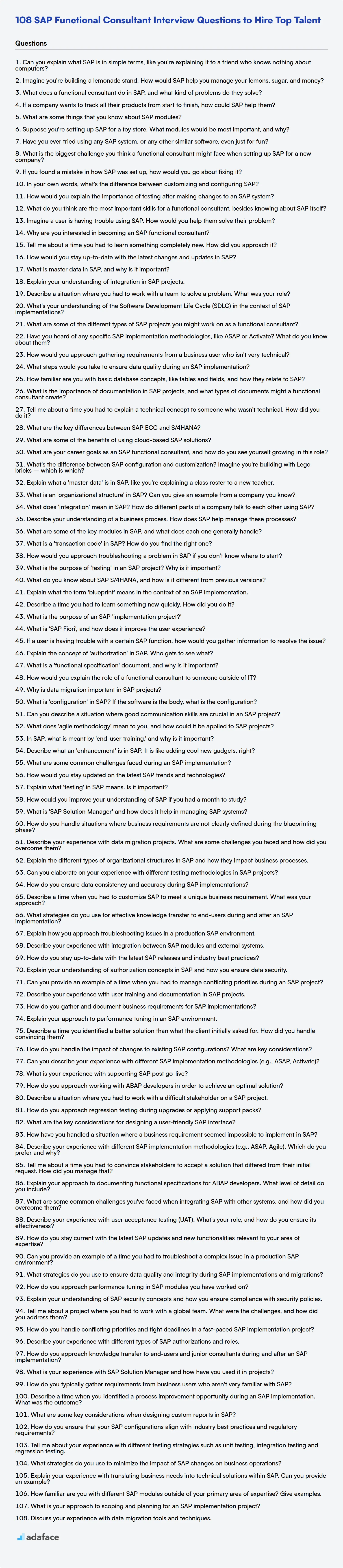Finding the right SAP Functional Consultant can be challenging, given the blend of technical SAP expertise and functional business process understanding required. Interviewers need a structured approach to identify candidates who not only understand SAP but can also translate business needs into technology solutions.