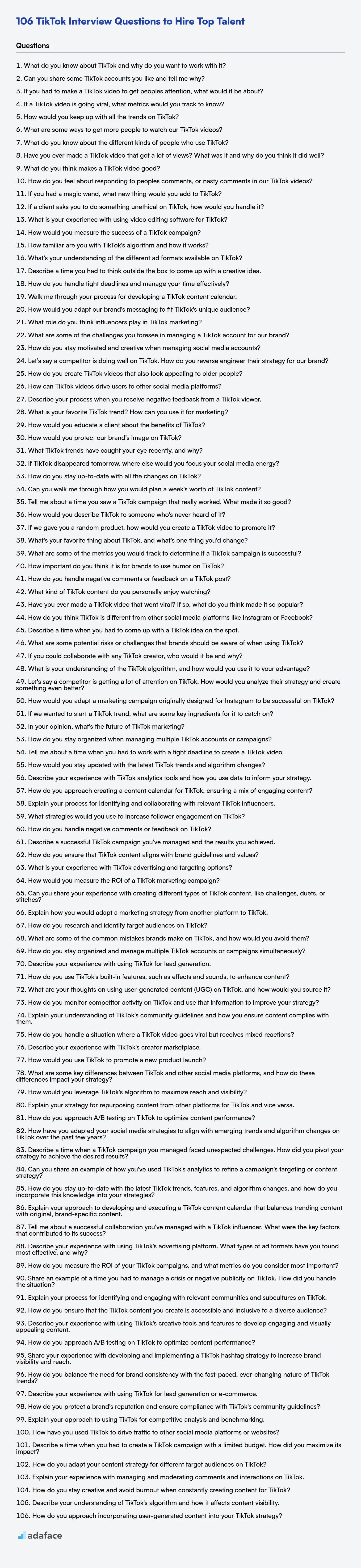 By using these questions, you'll be able to hire a TikTok social media manager who can elevate your brand's presence and connect with your target audience; use a TikTok marketing test to filter for the best candidates.