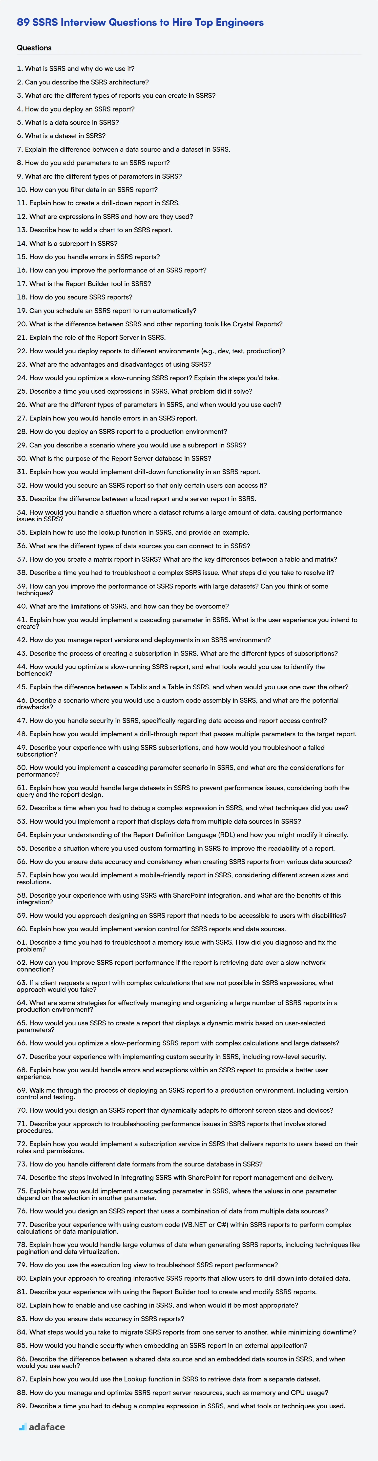 When evaluating candidates for SSRS (SQL Server Reporting Services) roles, interviewers need to ask the right questions to assess their technical skills and problem-solving capabilities. Avoid a bad hire, and focus on assessing the right skills, much like when you screen for SQL Developer skills.