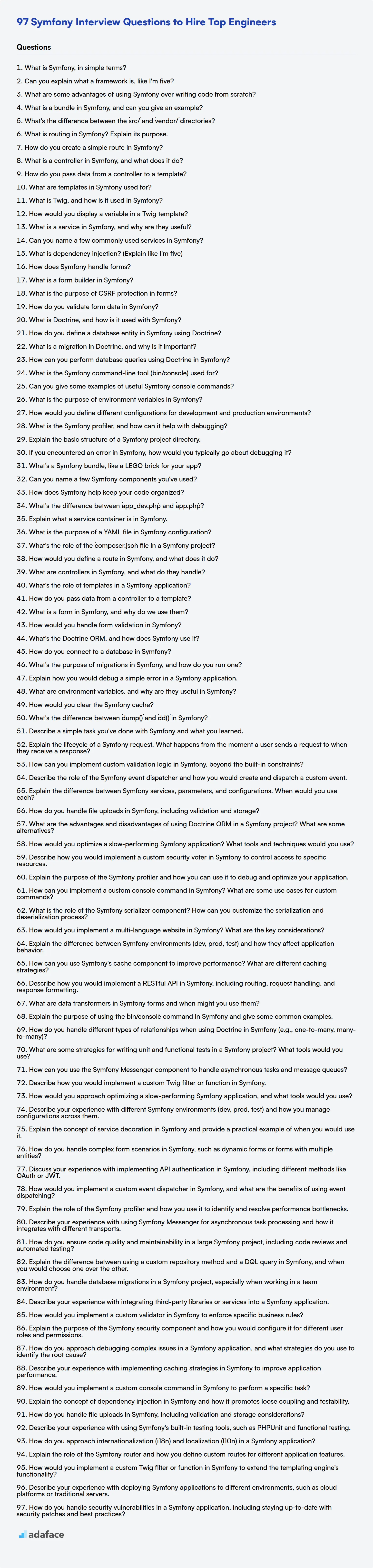 By using these questions, you will be able to better gauge the developer's skill level and assess their Symfony knowledge; alternatively, use a Symfony online test before the interview to save valuable time.
