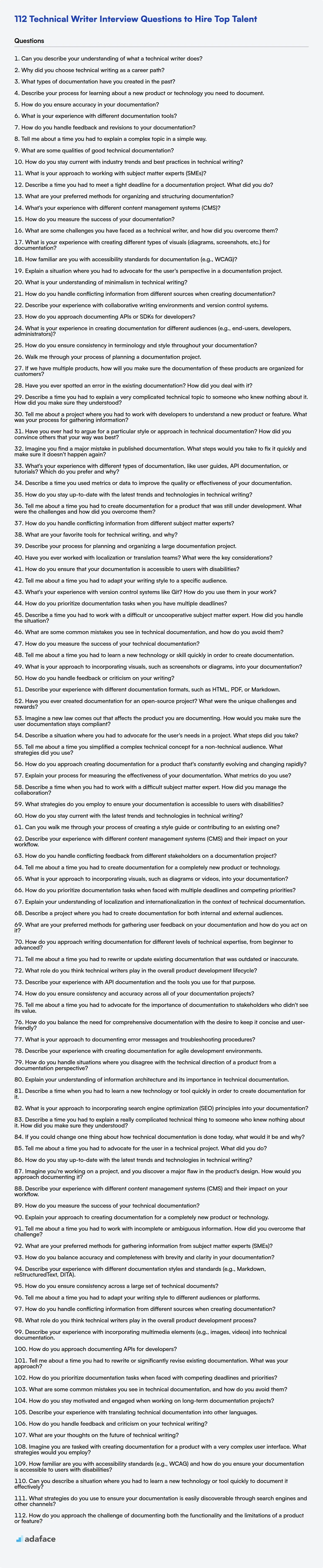 Leveraging these questions, you can zero in on candidates who demonstrate the skills you need; to assess candidates' writing skills before the interview, consider using a Technical Writer Test.